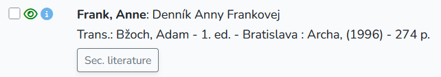 An entry in the DLBT consists of several parts. The bibliographic details are given in the DLBT standard citation format, and further information and data on the entry can be accessed via separate buttons to the left of and below. Each entry can be accessed via the search mask under the 'Online Search' tab. Depending on the type of text, data is assigned to one of two existing libraries: 'Translations and Adaptations' or 'Reception Documents'. Our example is a translation of Anne Frank's diary into Slovakian, published in Bratislava in 1996.