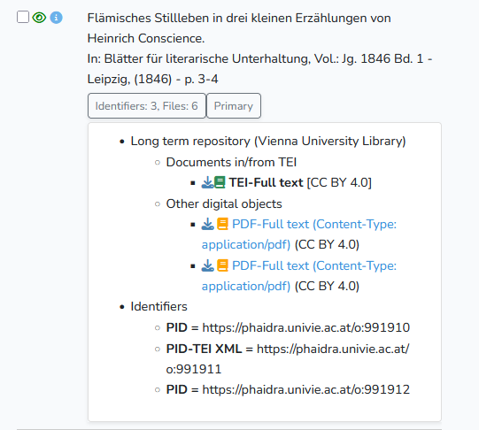 The DLBT has a bookshelf function that makes it possible to collect individual translations or reception documents in order to download or analyse their full texts (see the Howto section for analysis or visualisation). As a standard user, you only have access to files that are part of the long-term PHAIDRA repository.